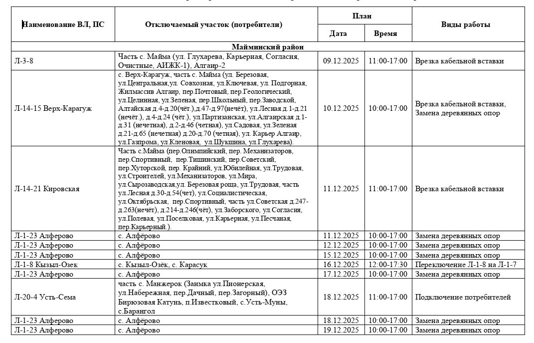 Плановые отключения электроэнергии в Майминском районе с 9 по 19 декабря 2025 г.