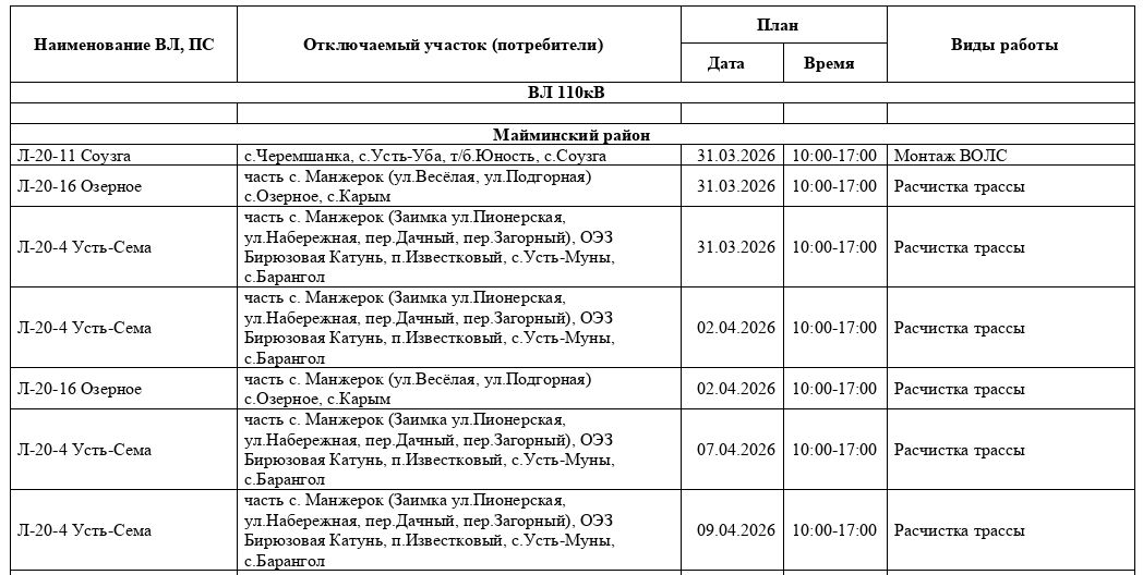 О плановых отключениях электроэнергии в сети 6-110 кВ с 06 апреля по 12 апреля 2026 года, а также уточнения с 30 марта по 05 апреля 2026 года.
