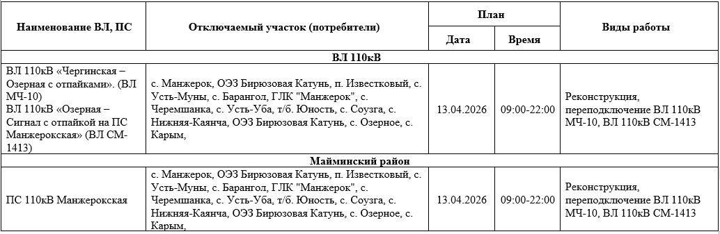 Плановые отключения электроэнергии в Майминском районе