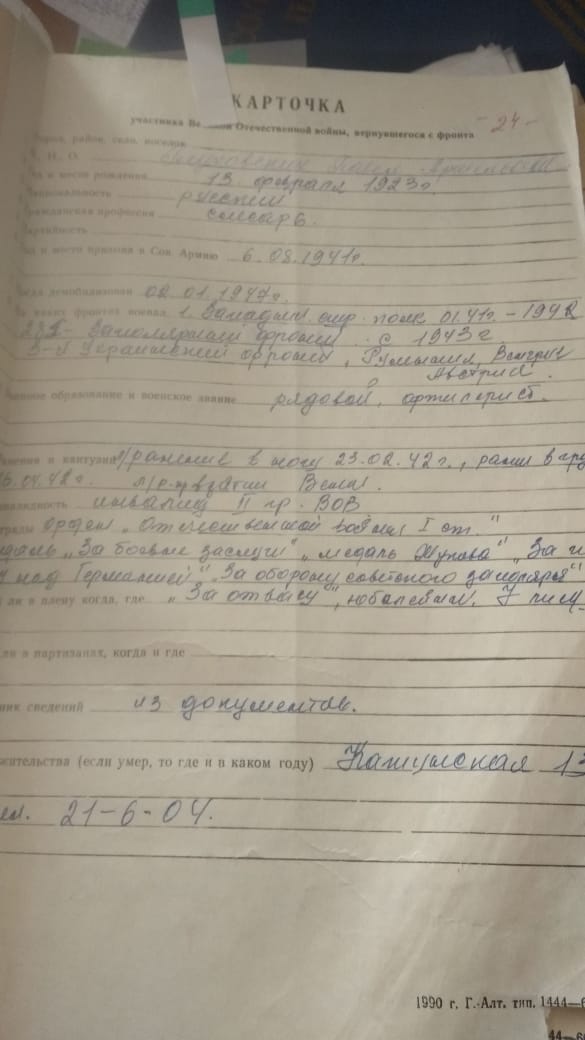 Анкета, заполненная со слов Павла Артемьевича Глуховских и предоставленная Т.В. Кульбедой (Музей камня)