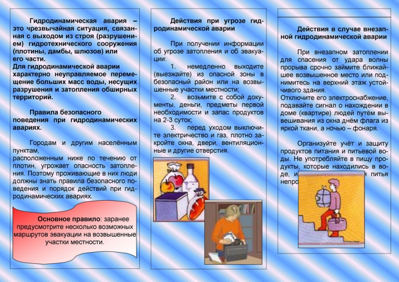 При эвакуации из дома необходимо взять с собой документы, ценности, вещи первой необходимости, запас питьевой воды и продукты питания на 2—3 суток. Часть имущества, которую требуется сохранить от затопления водой и нельзя взять с собой, надо перенести на верхние этажи зданий, чердак, верхние ярусы сооружений.